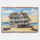 Throw in an illustration of an idyllic beach house stands on stilts facing the tranquil ocean, with a small boat resting on the sandy shore. The sky is bright and partly cloudy, adding to the serene coastal atmosphere.