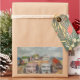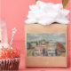 This sticker features an original oil painting by Anna Unterman of a little island off the New Jersey shore. A whimsical grouping of beach houses is clustered around a central sandy courtyard with a colourful clothesline full of laundry blowing in the breeze. Each house is a different pastel colour: pink, blue, white, green and brown. The bay is in the background with one sailboat. The sky is partly cloudy. Reprinted with permission from the estate of Anna Unterman. All rights reserved.