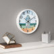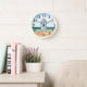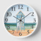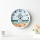 A cute watercolor beach hut with sand and ocean white framed clock. Whimsical style for a beach house or for coastal design home decor.