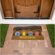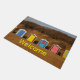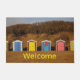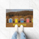 Doormat with photo of colorful beach huts and blue sky at Saunton Sands, Devon, England.