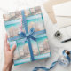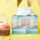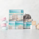A wedding invite with custom names and envelope rests on a sandy beach surrounded by seashells, a starfish, and a turquoise ocean background.