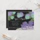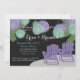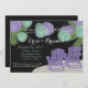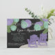 Purple and green paper lanterns over adirondack chairs, beach theme couple's shower invitation.