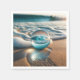 A glass sphere on the sandy shore reflects and refracts ocean waves within it, while the gentle foam of the sea surrounds it