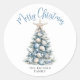 Celebrate in sunny style with this festive round sticker, perfect for your tropical holiday celebration. A large Christmas tree made of beach shells, starfish, and coral sits in the center, bringing a fun and whimsical coastal vibe to your event. The design features a teal blue and tan color palette that captures the feel of a beachy Christmas.