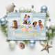 Send warm Christmas wishes from the beach with this personalised coastal holiday card with 3 photos, and “Merry Christmas” script calligraphy printed with real gold foil. In the centre is a group of watercolor seashells, with a beach wood background.