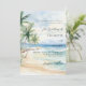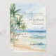 An elegant wedding invitation for a beach wedding, destination wedding. A watercolored sandy beach, ocean waves and palm trees as background.