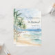 An elegant wedding invitation for a beach wedding, destination wedding. A watercolored sandy beach, ocean waves and palm trees as background.