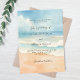 A wedding invitation for a beach wedding, destination wedding. A watercolored sandy beach, ocean waves and a blue sky as background.