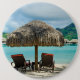 Button with a thatched parasol and two sunlounger chairs on a white sand beach in a luxury overwater bungalow resort in the clear blue lagoon of the pacific island of Bora Bora, near Tahiti in French Polynesia.