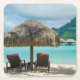 Coaster with a thatched parasol and two sunlounger chairs on a white sand beach in a luxury overwater bungalow resort in the clear blue lagoon of the pacific island of Bora Bora, near Tahiti in French Polynesia.
