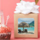 Souvenir photo sticker of a thatched parasol and two sunlounger chairs on a white sand beach in a luxury overwater bungalow resort in the clear blue lagoon of the pacific island of Bora Bora, near Tahiti in French Polynesia.