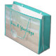 Large Christmas gift bag with beach background on both sides. Customise the wording on the front - sample text is “Seas and Greetings” with a white sand dollar on the beach sand design. The back of the bag also has a tropical beach image with three blue tree ornaments hanging from the top.