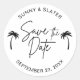 Beach inspired save the date stickers feature your names and wedding date with "Save the Date" in the centre in modern handwriting script, accented by palm trees. Perfect for beach, tropical and destination themes.