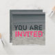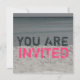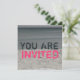 An invitation featring a black / white / colour photo of a beach scene consisting of sand, water, and the sky. Dark aqua and hot pink text reads "YOU ARE INVITED." Opposite side features photo background of ocean water. Personalise the text with details of your occasion.