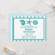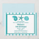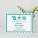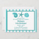 This fun beach party invitation features a sea shells and a starfish and customisable text on a teal and white striped background.