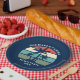 Cute beach party paper plate for summer or spring break on an island cruise or tropical seaside trip. Features beautiful palm trees in front of a pretty ocean sunset. Customise for a family reunion or other coastal bash.