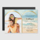 Add your own vertical size photo. Watercolored beach and waves as background, black text. Personalise and add your names and details.