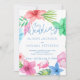 Trendy modern beach wedding invitation with pink and blue teal tropical Hawaiian flowers with a watercolor washed blush pink on reverse and with a fancy aqua blue typography script. Perfect choice for a modern beach, sea, oceanfront, coastal, tropical, nautical or Hawaii destination themed wedding.