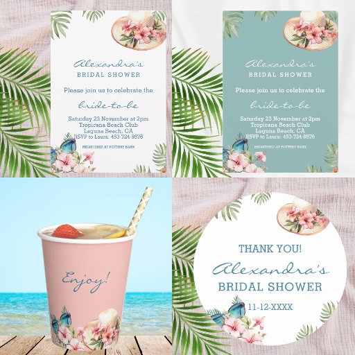 Customise this Floral Beach Bridal Shower Invitation, and add a Chic Touch to your Celebration. The Pastel Pink Tropical Hibiscus Flowers, Beach Hat and Sunglasses, against a Dusty Blue Background, are perfect to set the tone for a Fun in the Sun, Chic Beach Wedding Shower Party or Picnic.