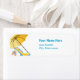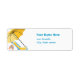 A graphic illustration of a beach lounge chair and flip flops on a pool/beach party return address label. The label has text templates for your personalisation. ©2013charmainepaulson
