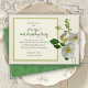 Floral birthday party invitations for her. Pretty beach rose stem with white flowers and cream buds decorates this horizontal invitation. Ecru and green colors with three places for your text. The layered appearance holds all text in an off-white panel using bold script for the honoree’s name and party text. The remainder of the text is uppercase printing. Modern and lovely, realistic floral design, for celebrating a woman of any age. A leaf pattern in green covers the back of the paper. Upgrade the paper for a more elegant look.
