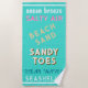Pretty turquoise blue green background with geometric white stripes. Fun beach themed typography including Beach sand, Ocean breeze, Seashells in various fonts in white, pink, tan and blue. Geometric white stripes on each end. Original Design by TamiraZDesigns.