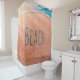 Sandy beach shoreline blue ocean waves. Coastal seashore nautical theme bathroom shower curtains. Beautiful, tropical inspired summer vacation scene home decor. Chic, trendy, modern, elegant, cool travel design. Typography can be customised. Image copyright Marg Seregelyi Photography.