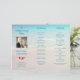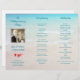 Beach wedding ceremony program to fold in thirds, with photo template and plumeria flowers. Turquoise water and matching text over a beach sand image with square photo of the couple, which will be on the front of this folded program. **Please note, the back of this paper will be white - nothing can be added to the back.