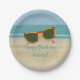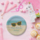 Painting of a beach scene of sand and ocean, with an inlaid image of painted sunglasses, decorate these personalised birthday paper plates. Easily customise the name or message, on the template form.