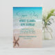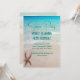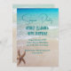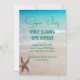 Beach scene and starfish surprise party invitations with digital sharing option. A single starfish, or sea star, decorates the bottom corner. Turquoise ocean water and little waves lapping the shore is the background image. Add your custom text using the templates. Text is in aqua blue color using modern fonts. Upgrade the paper for printed versions, or choose the instant download to share online.