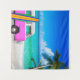 This tropical beach scene design features a bright fuchsia pink van and colourful surfboard near palm trees and on a white sand beach with turquoise sea blue water. This is the perfect design for a party photo booth backdrop, or for the surfer, for the college student's dorm room, for a bedroom, office, or any space where you want to bring in the tropics. Design and photographs of the beach and palm trees by T.K. Goforth and signed by the artist, all rights reserved.