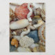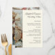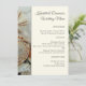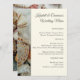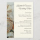 Seashells wedding menu template. Created for a simple reception with two text templates that align to the right. Add a title that includes the names of the couple. All menu items are listed in a paragraph using spaces to separate sections for appetizers, entrées, and desserts, or your choice. Font is script and printed fonts in dark gray. The full image of the beach shells is on the back of the paper. The design will work on some of the other sizes. No text should be close to the edge of the paper.