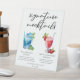 This chic beach signature mocktails pedestal sign features simple black typography above 2 seaside drinks and their ingredients for your coastal party. A cute Blue Hawaiian sunrise drink and non-alcoholic Strawberry Daiquiri drawing add a cool flair to your bar menu. Complete with the couple's names and date for their reception.