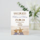 Romantic SAVE THE DATE postcards with pair of cute starfish in the beach near the sea or ocean.