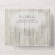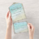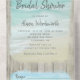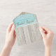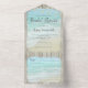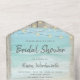 This all-in-one bridal shower invitation includes the invitation plus a tearaway recipe card at the bottom, and can be folded and mailed so you don’t need an envelope. Framed with a background of rustic weathered grey wood, beautiful aqua blue ocean waves crash against the beach and string lights decorate the top. These bridal shower invitations are perfect for destination weddings, as well as any beach and coastal themed wedding.