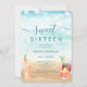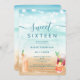 Fun summer string lights script Sweet sixteen birthday party on blue sea ombre gradient sandy beach watercolor. A fun cool party theme, perfect for outdoors party, bbq, garden party, beach and pool party with watercolor cocktails.
