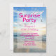Beach sunrise birthday party invitation template. Bright magenta pink text is part of this layered design. The sun is rising over the ocean as seagulls fly overhead. This is the background image for your text to be placed in three templates. The first lines are in bold printing and although the sample is for a “surprise party”, the invitation works for many events. The second template is for the name of the honoree with all party information in the bottom paragraph. The back is also fuchsia pink.