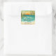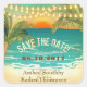 Palm trees and string lights frame the ocean sunset and sandy shore on this lovely beach wedding sticker.Customise this text with your wedding information.