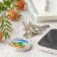 At The Beach © Sunny Mars Designs. This cute colourful premium round keyring or keychain features a fun vector illustration of a beach scene with beach items including a beach umbrella, a beach ball, flip flops, a bucket and spade, palm trees, a beach towel and a surfboard.