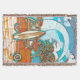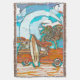 Old fashioned surfboard and woodie station wagon artwork.