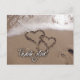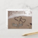 Thank you in white script font against a sandy beach with two hearts drawn in the sand. Perfect for the beach wedding couple for their thank you notes.