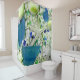 Beach seashell theme bathroom shower curtain in a graphic design that displays a starfish, seashells, along with sea glass in a still life image that decorates your bathroom in tropical beach style suitable for a beach home or any home decorated for Florida decor.