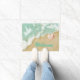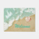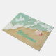 Beach themed front door mat done in lovely artwork of foaming water and a sandy beach, with a seashell. Personalise the sea foam green text to read what you want. What a lovely way to welcome guests to your home.