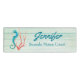Seaside beach themed employee name tag done in aqua green washed out looking wood slates, with graphics of a colourful seahorse and coral, on the left side. Personalise the aqua blue text to suit your business needs.