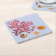 Blue paper coasters to match the plates and napkins for your beach theme party. Decorated with red fan coral and seashells.