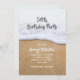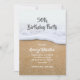 Beach sand birthday party invitation for him. Suitable for anyone, and for any type of event, custom text is in grey and white over a beach image. Reverse is solid light grey.
