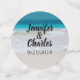 Fun beach themed party table confetti, with graphics of sand dollars, beach balls and pretty sandy beach with black text. Personalise the text for your wedding, celebration or special occasion.