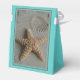 These beach themed wedding favour boxes feature a photograph of a starfish in the sand as a focal point with an imprint of a seashell. The photograph is surrounded with a beautiful aqua colour and a lovely white ribbon is used to close the favour box with the words "Thank You" appearing right below the ribbon. This is a beautiful favour box for a beach themed wedding reception. Copyright htenishouseofpaper