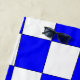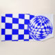 Chequered pattern in blue and white. Optical illusion of a rounded sphere distorts the squares to curve into a ball shape.