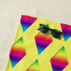 Diamond shapes with rainbow colours from top to bottom (green, yellow, orange, red, pink, purple, blue). Diamonds placed on a yellow background give optical illusion of lattice-work with rainbows behind.